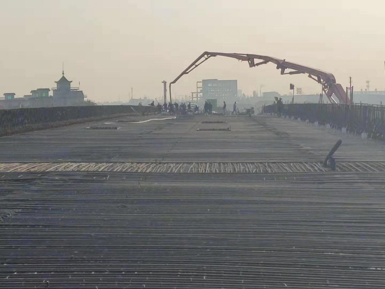 此處箱梁頂板砼澆筑完成,標(biāo)志著紅十五改建工程TJ-3標(biāo)段向著順利峻工又邁進(jìn)了一步。接下來(lái)待養(yǎng)護(hù)期時(shí)間過(guò)后并且預(yù)應(yīng)力張拉完成,會(huì)進(jìn)去最后的護(hù)欄建筑和橋面瀝青施工階段。