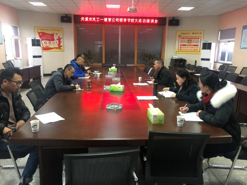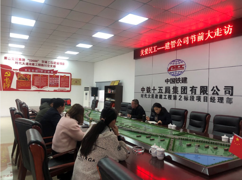 1月10日,交通建管公司黨支部書記楊涌、工會主席王國芳對紅十五線改建工程、03東復線高架南延工程、03省道蕭山義橋至樓塔段改建工程、時代大道改建工程四個項目召開了一場“關愛民工——建管公司節前大走訪”的座談會,對年前民工返鄉情況進行詳細了解。