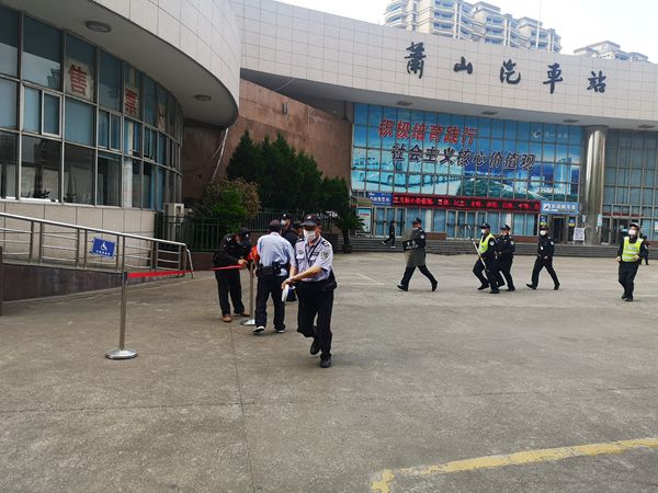 演練從售票大廳引導員發現在大廳椅子下有一包裹,疑是無主包裹,于是上前詢問周邊乘客,確認為無主包裹后,立即向值班站長報告,值班站長接報告后,組織站務人員一起做好110報警、開啟廣播(播放專題音樂)、匯報客運分公司經理、組織疏散、組織警戒等工作,保安人員立即向安保部和駐站分管民警匯報,同時啟動反恐應急預案,組織人員趕往現場,在售票大廳外區域拉警戒線。五分鐘后防爆人員趕到現場將“可疑包裹爆炸物”用防爆毯蓋住,確認安全后帶走。