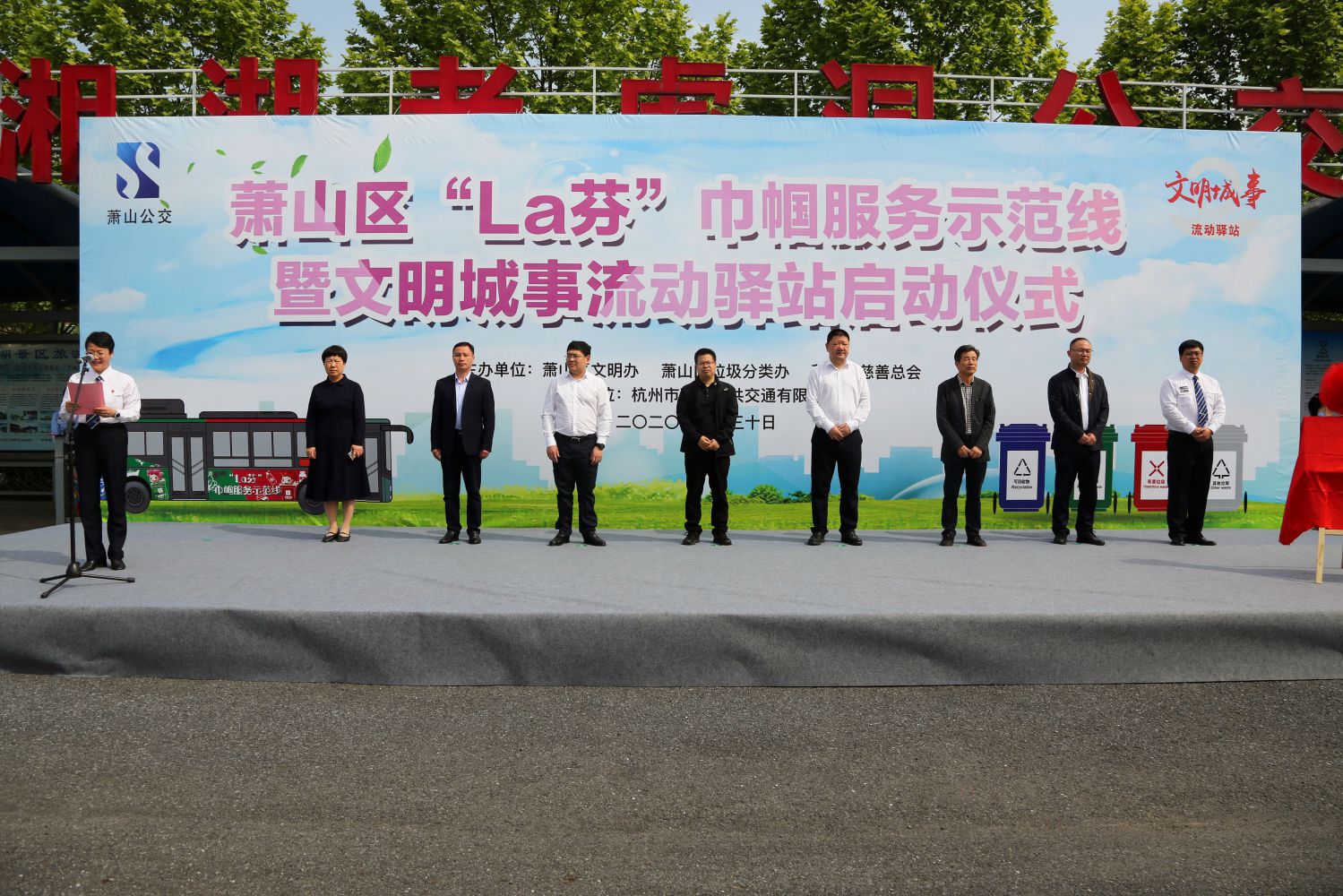 4月30日上午,蕭山公交聯合蕭山區文明辦、區垃圾分類辦聯手打造的“蕭山區‘La芬’巾幗服務示范線暨文明城事流動驛站”在湘湖老虎洞公交站正式啟動。蕭山區委常委、宣傳部長趙文虎,副區長、區美麗辦主任方軍,區交投集團黨委副書記、總經理徐寧軍,區慈善總會秘書長王和瑞、區城市管理局黨委委員、美麗辦副主任李中華、區文明辦副主任王偉東、區交通運輸局黨委委員、副局長、道路運輸管理處主任步蘇琴出席活動,蕭山公交班子成員、干部職工代表、巾幗司機代表等人員參加儀式。
