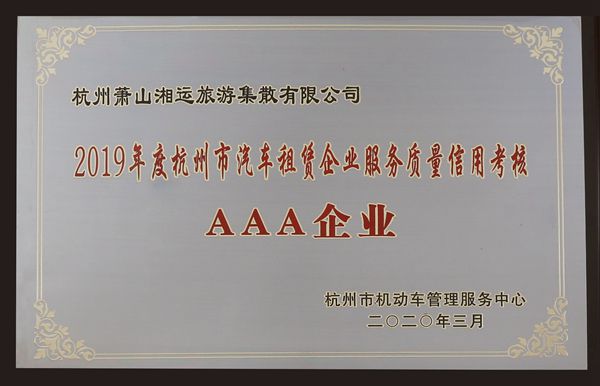 近日,長運公司下屬湘旅公司喜獲由杭州市機動車管理服務中心授予的“2019年度杭州市汽車租賃企業(yè)服務質量信用考核AAA企業(yè)”榮譽稱號。