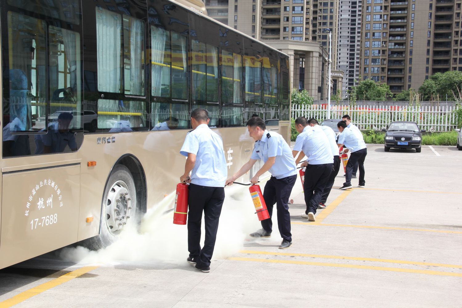 為強化公司安全管理,增強員工安全意識,提高突發事件應急處置能力,推動第19個“全國安全生產月”活動深入開展,6月17日下午,蕭山公交工會在城南停車場舉辦“消防突發事件應急聯動處置演練”活動。區交通派出所警官俞明德、區交投集團企管部經理陳鋒、副經理王軍民、消防專家徐曉偉等領導蒞臨指導,公司班子、各單位負責人、義務消防隊員、班組長代表、司機代表、保安代表等100余人參加觀摩。