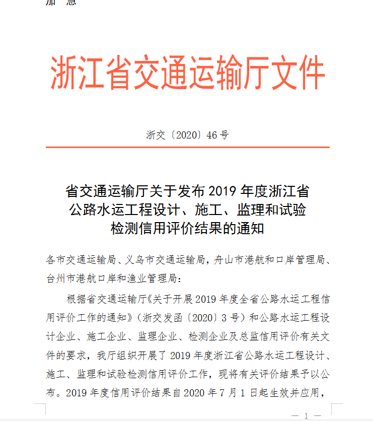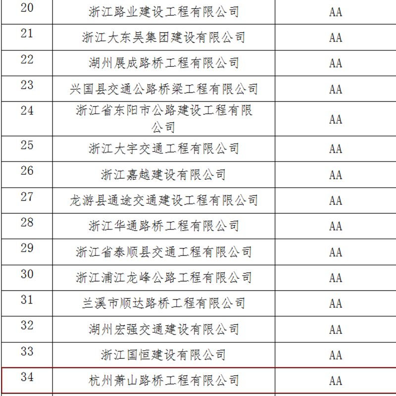 根據(jù)浙交[2020]46號(hào)文件發(fā)布的2019年度浙江公路水運(yùn)工程設(shè)計(jì)、施工、監(jiān)理和試驗(yàn)檢測(cè)信用評(píng)價(jià)結(jié)果,蕭山路橋工程有限公司獲評(píng)2019年度浙江省施工企業(yè)信用評(píng)價(jià)AA級(jí),這也是公司自2006年省交通運(yùn)輸廳開(kāi)展施工信用評(píng)價(jià)以來(lái),第12個(gè)年度被評(píng)為AA級(jí)信用企業(yè)。