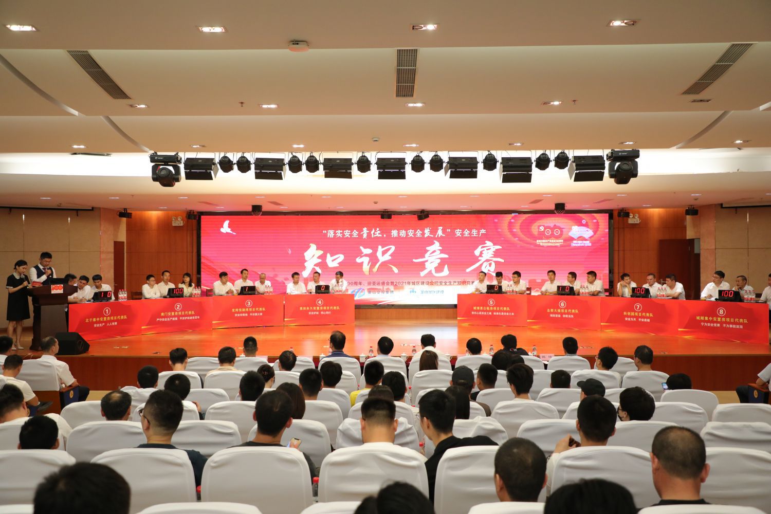 本次競(jìng)賽分為個(gè)人必答題、搶答題、簡(jiǎn)答題和附加題四種競(jìng)賽形式,內(nèi)容涵蓋了安全生產(chǎn)相關(guān)法律法規(guī)、安全管理、消防知識(shí)等。由公司員工代表及各參建單位組成的8支代表隊(duì)登臺(tái)參賽,各參賽代表隊(duì)朝氣蓬勃、斗志昂揚(yáng),參賽選手精神飽滿、沉著應(yīng)答。