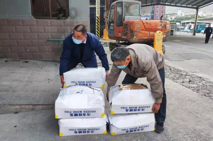 快件托運人員佩戴口罩搬運貨物