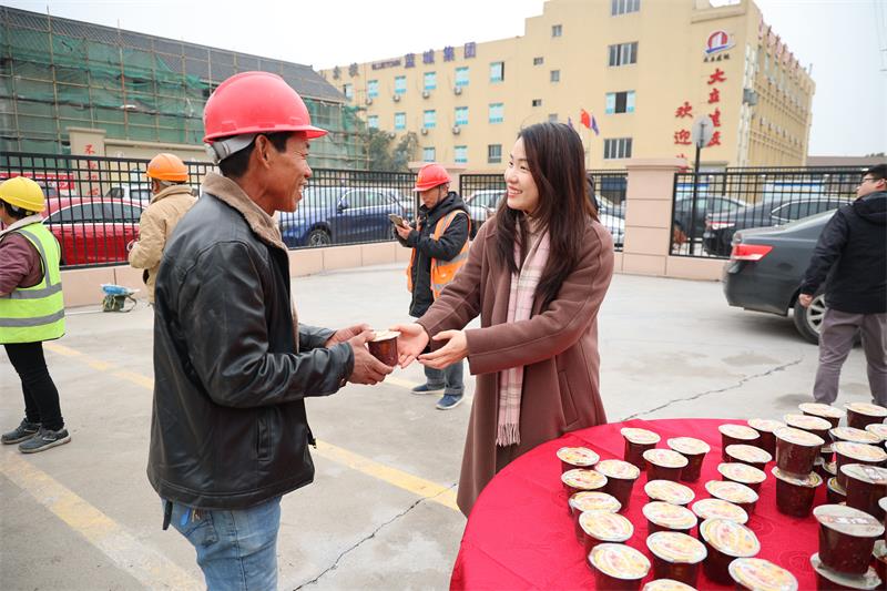 建筑工人劉桂英捧著臘八粥開心的說:“真的很好喝,每年都能喝到公司分的臘八粥,感覺心里暖暖的,我老公還在上面干活,我可以給他帶一份嗎?”“當然可以了”辦公室主管孔佳俐笑著答道。此次送粥活動不僅弘揚了傳統(tǒng)民俗文化,更體現(xiàn)了公司對所屬工地民工的一份關(guān)切和熱愛。