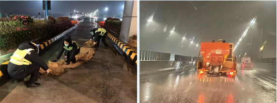 機場高速公司嚴陣以待,迅速部署抗雪防凍工作,第一時間按預案成立領導小組和組織應急搶險隊,24小時在崗待命執行任務,組織人員和機械設備,對匝道、收費廣場、橋面、坡道等重點監控路段撒布融雪劑、鋪設防滑草袋進行除雪保暢。正月初二夜間共出動撒鹽機3臺次,撒布融雪劑12噸,投入搶險人員20余人,預警巡邏車4輛次。