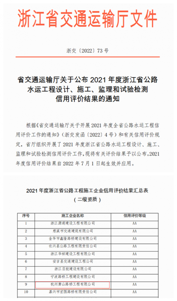 6月28日,浙交〔2022〕73號(hào)文件公布了2021年度浙江省公路水運(yùn)工程設(shè)計(jì)、施工、監(jiān)理和試驗(yàn)檢測(cè)信用評(píng)價(jià)結(jié)果,路橋工程公司獲評(píng)2021年度浙江省施工企業(yè)信用評(píng)價(jià)AA級(jí),這也是公司自2006年省交通運(yùn)輸廳開(kāi)展施工信用評(píng)價(jià)以來(lái),第14個(gè)年度被評(píng)為AA級(jí)信用企業(yè)。