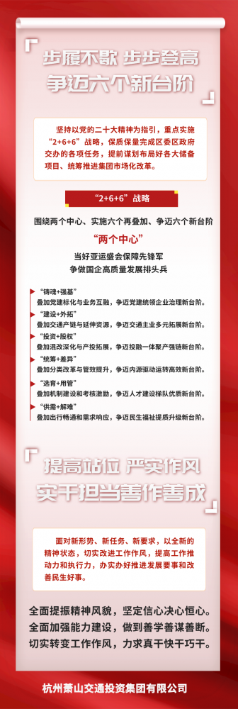 蕭山交投集團作為我區交通建設主力軍,在全區各項重點任務的大考大戰中展現出敢于擔當、敢于攻堅、善作善成的奮斗姿態,“發展快,效能高”、“任務重,站位高”、“轉型快,覺悟高”、“作風硬,情懷高”,工作值得肯定。