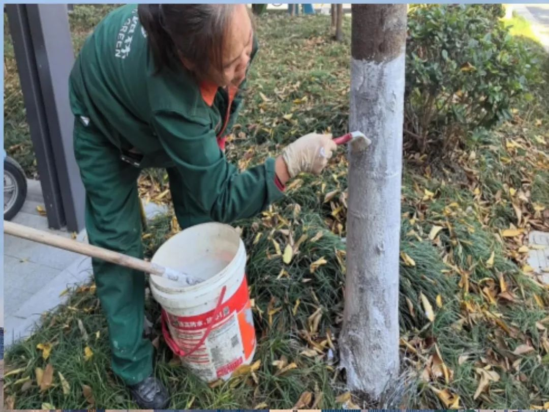 除了設施設備,綠化師傅們為小區內的綠植樹木也穿上了“冬裝”。冬季嚴寒,干燥多風,會對部分樹木造成凍傷或者造成“生理干旱”,輕則部分枝條受損,重則會全株死亡。刷白漆能夠使樹木安全過冬,來年春天生長的更加茂盛。