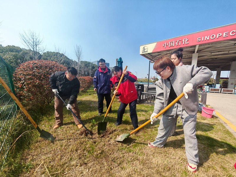 現(xiàn)場,大家分工協(xié)作,揮鍬挖坑、扶苗培土、澆水定根,將樹苗植入站區(qū)空地,為加油站添上盎然春意。活動中,大家還結(jié)合崗位暢談低碳理念,把環(huán)保初心融入日常服務(wù)。