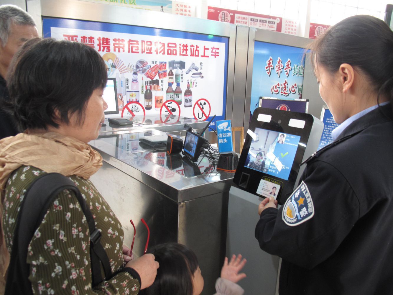 十月中旬開始,蕭山汽車總站入口安檢處全面啟用人證票合一核驗(yàn)、人臉識(shí)別系統(tǒng),確保“人證票合一”。通過人證合一認(rèn)證終端,將現(xiàn)場(chǎng)人臉照和證件照快速進(jìn)行身份驗(yàn)證比對(duì),同時(shí)核驗(yàn)是否有購(gòu)票記錄,只有三者驗(yàn)證一致后旅客方能進(jìn)入候車區(qū)域。