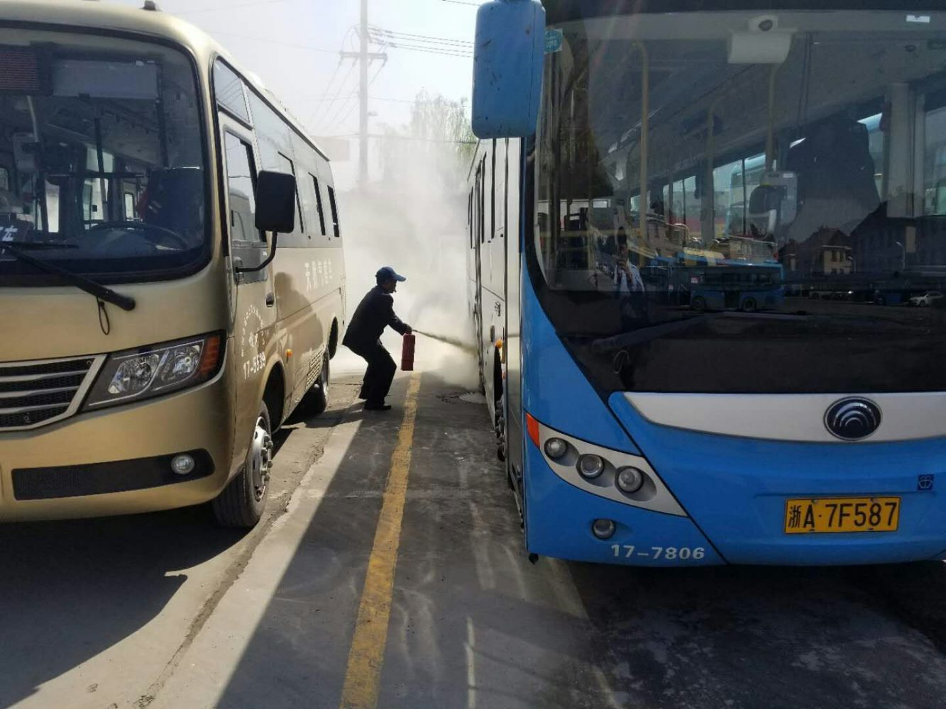 10時05分,場區(qū)啟動停車場消防應(yīng)急預(yù)案。10時06分,場站人員發(fā)現(xiàn)義橋公交站東南區(qū)塊濃煙滾滾,迅速吹響口哨并打開大門,同時通知在場人員火警情況;10時07分,司機(jī)、站員、物業(yè)人員迅速趕至起火點開展滅火自救,并由傅隊進(jìn)行指揮,10時08分,消防水帶出水,10時09分“火勢”撲滅,警報解除。