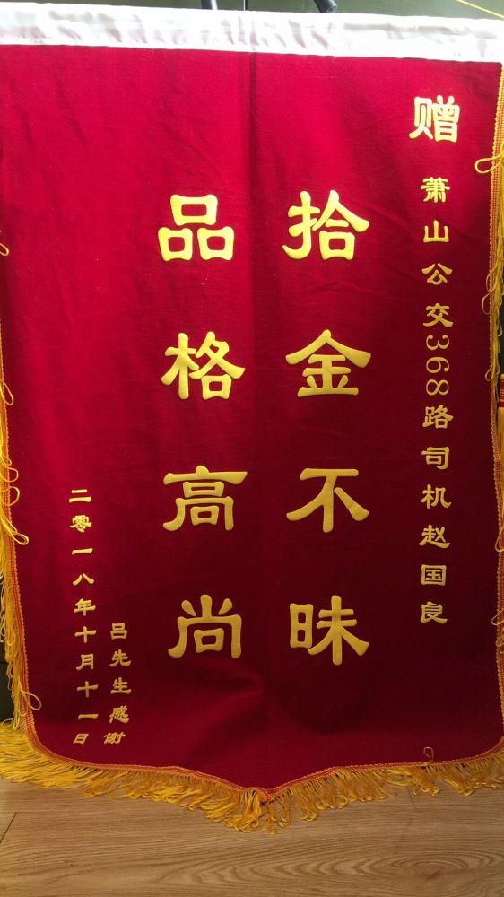 近日,蕭山公交三車隊駕駛員趙國良受到蕭山電視臺采訪。原來,10月11日早上趙國良駕駛368路途經紅門巷康順路口時,發現斑馬線上有一錢包,于是當即靠邊停車,撿回錢包。經查,錢包內有大量現金、各類證件。考慮到可能是來醫院看病的市民掉的,司機到站后立馬上交給了車隊管理人員,并通過派出所聯系到了失主,領回了錢包。原來失主呂永濤正是前往浙二分院學習的醫生,因當天上午手術緊急,一路小跑才不慎遺落錢包。呂先生對駕駛員這種拾金不昧、品格高尚的行為稱贊不已,次日還特地送錦旗到車隊以表示深深的感謝。