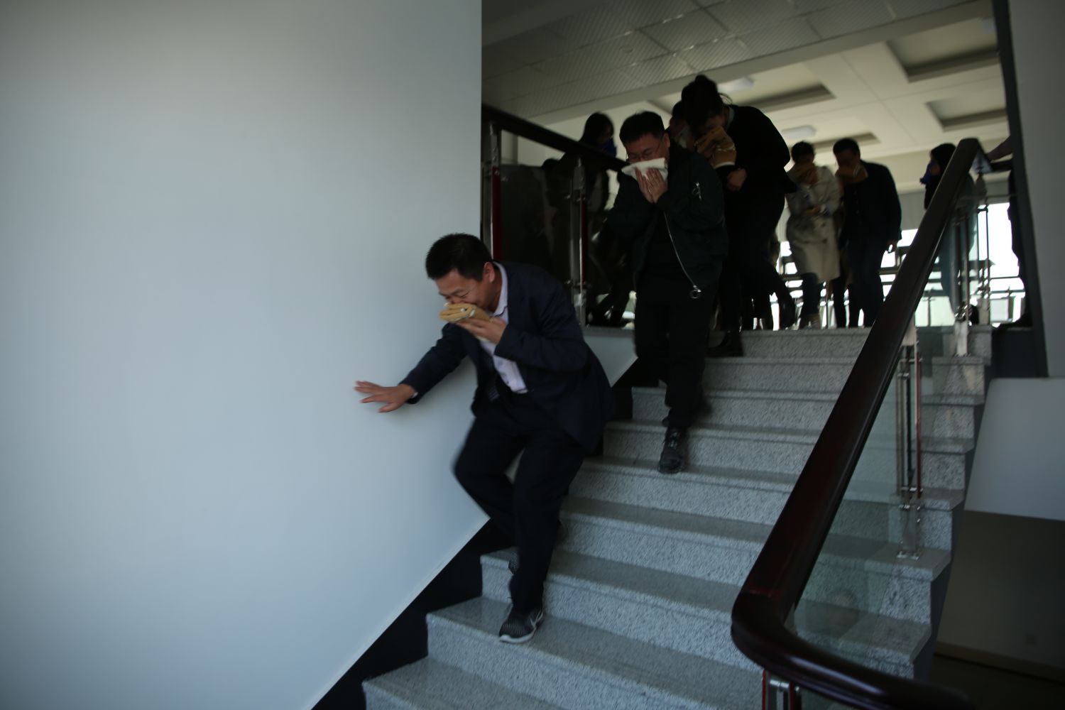 15時37分,培訓(xùn)現(xiàn)場模擬火情發(fā)生,現(xiàn)場指揮人員發(fā)出疏散指令。安全員吹響哨子、手持小紅旗在前引路,參與演練人員用濕毛巾捂住口鼻,依次順著疏散樓梯右側(cè)向下撤離至大樓室外廣場。整個撤離過程緊張、安全、有序,從發(fā)出疏散指令到人員全部撤離至大樓室外廣場,用時2分05秒。