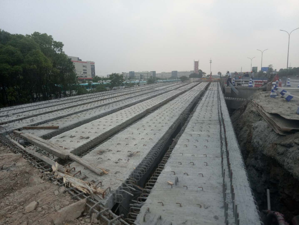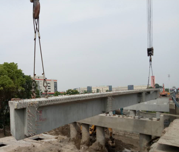 原雷山橋位于紅十五線與雷山河交界之上,新建成總長為40.5M(其中跨徑20M*2)、可供雙向六車道通行。在施工過程中為保證邊通車邊施工的安全,確保此次安裝能順利完成,3標(biāo)項目部領(lǐng)導(dǎo)和技術(shù)員在梁板安裝前對現(xiàn)場作業(yè)人員進(jìn)行了詳細(xì)的施工技術(shù)及安全交底,現(xiàn)場施工過程中,技術(shù)人員認(rèn)真核對設(shè)計圖紙,嚴(yán)格做好抓安全、保質(zhì)量工作,對每道工序施工質(zhì)量和報驗程序進(jìn)行嚴(yán)格把關(guān),保證各道工序?qū)訉勇鋵嵉轿弧1O(jiān)理組全過程進(jìn)行旁站對施工各環(huán)節(jié)進(jìn)行監(jiān)控。本次梁板安裝,施工單位配備相關(guān)工作人員24名,其中有起重工6名,運輸車司機(jī)4名、吊車司機(jī)2名、指揮1名、以及其他相關(guān)工作員11名。主要使用一輛100T吊機(jī)和一輛80T龍門吊用于現(xiàn)場吊裝作業(yè),4輛T梁運輸車用于梁板運輸,電焊機(jī)2臺用于焊接鋼筋。